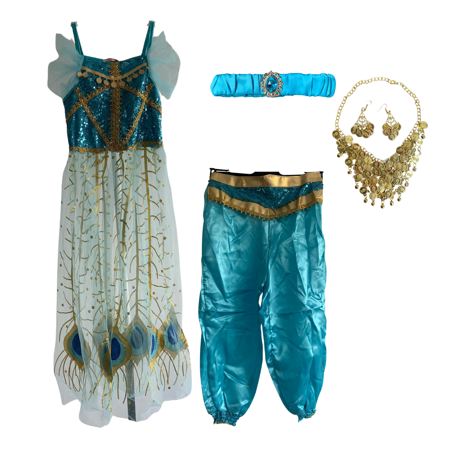 Set: 1 Oberteil, 1 Hose, 1 Haarband, 1 Halskette, 2 Ohrringe.