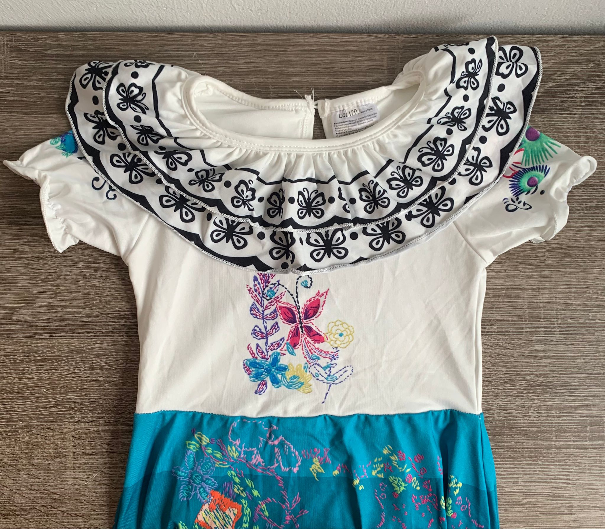 Gebraucht (siehe Fotos). Kostüm Kleid Mirabel Madrigal Ballerina Kleid mit Tasche und Zubehör, 120 (Länge 75 cm, Brust 64 cm, empfohlene Höhe 110-120 cm).